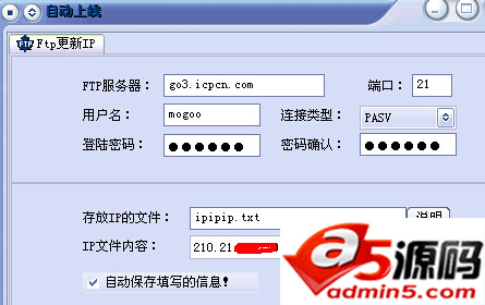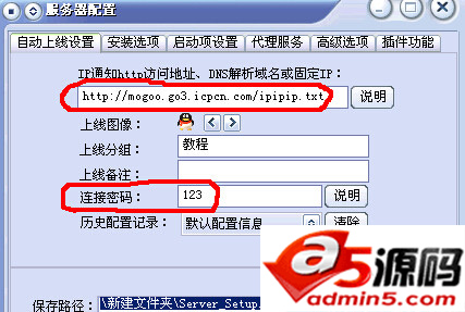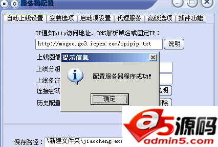 3、下来点配置服务程序,先点自动上线设置,IP通知那里添上你FTP在HTTP的访问地址加上你放IP文件的地址