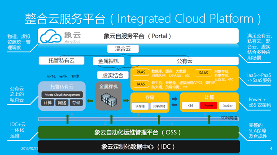 象云采用IDC+云一体的服务模式, 能够为企业云平台提供完整的SLA保障, 同时解决企业用户在数据中心和云计算两个方面的需求; 同时象云依托于自身强大 的运维管理平台, 能够同时为企业用户提供物理服务器的管理、公有云以及自动部署和管理私有云的服务, 也就是说无论是物理服务器还是公有云以及私有云都可以通过一个平台来进行管理和调度; 另外, 象云的底层网络采用基于万兆的的SDN服务模式, 用户可以通过平台自服务的功能, 轻松的完成物理服务器与公有云和私有云的网络连通配置, 也就是说在象云平台, 用户可以快速的构建虚实结合以及混合云的业务场景, 满足用户在不同发展阶段对于云平台的需求; 另外, 象云的公有云和私有云采用同样的技术架构和运维体系, 也就是说未来象云在公有云上提供的服务和产品, 在私有云上同样可以获得。