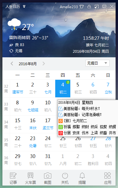 人生日历是一款基于万年历功能的时间管理工具。除了最基本的公农历、节假日、天气预报、星座查询,它还能帮你解决生活中方方面面看似乱七八糟的事情: