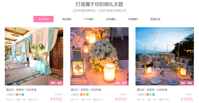套餐式婚礼主题,让用户多样化的选择同时更有专业的设计套餐供用户可选。