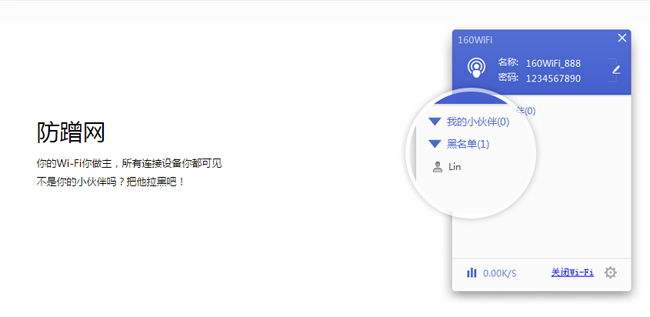你自己花钱办的网络,如果被无良的人盗用,那么就得不偿失了。随着现在技术的发展,想要蹭网也并没有那么难,这时候160WiFi的防蹭网功能就显得非常必要了。轻松可见所有的连接设备,不认识的陌生设备,对不起,是拉黑你的时候了。