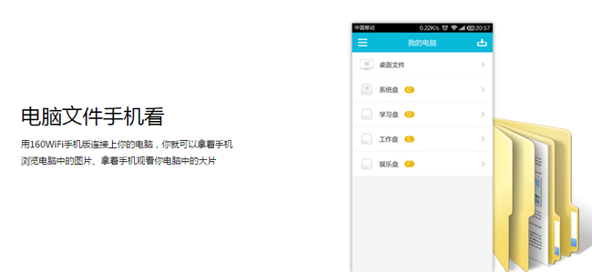 160WiFi的手机版功能同样强大,对于懒人来说,不想起身开电脑,想要在床上躺着浏览电脑当中的文件怎么办呢?160WiFi手机版就可轻松帮您实现您的懒人梦,无论是电脑当中的大片还是图片,都可使用手机轻松浏览。躺着玩电脑跟你就差一个160WiFi的距离。