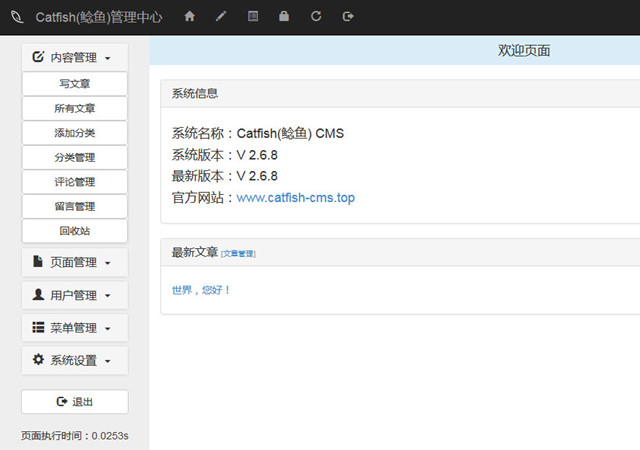 右边是欢迎界面显示了系统信息和最新文章等内容。