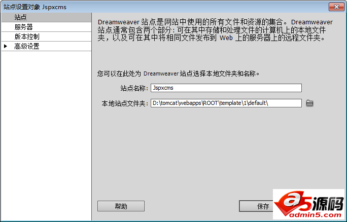 点击DW菜单“站点”-“新建站点”,填写“站点名称”,“本地站点文件夹”选择到站点模版所在路径,如{网站根目录}/template/1/default,点“保存”。