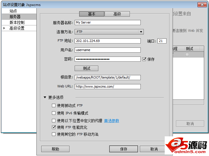 点击DW菜单“站点”-“管理站点”,双击要修改的站点,点击“服务器”-“添加新服务器”,填写“FTP地址”、“用户名”、“密码”,“根目录”对应服务器网站的模版根目录,如{网站根目录}/template/1/default,更多选项里可以根据需要勾选或取消“使用被动式FTP”,高级选项里可以根据需要勾选“保存时自动将文件上传到服务器”。