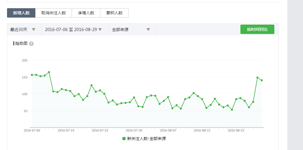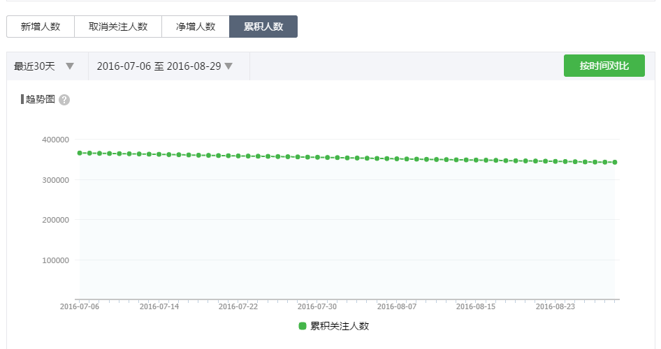 另外新关注人数、取消关注人数和净增关注人数的曲线,是在一定区间内不规律起伏的,而不会出现持续异常的增加。而与这些曲线相反的是,累计关注人数会一直保持一个平缓的趋势,且不论目前是一直掉粉还是持续增粉,累积关注的人数不会出现断崖式的增减。
