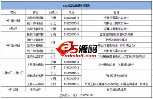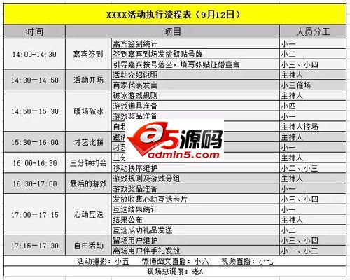 活动流程:活动流程表根据活动环节安排而定,从开始到结束每项工作分配到个人。大活动的流程复杂用到资源众多牵涉人员很多,更需要细致,不过一般会有专门的执行人员帮忙制作,可能很多人用不到。所以这里就以50人相亲的小活动为例,大家熟悉基本套路,根据自己活动有所增删即可。