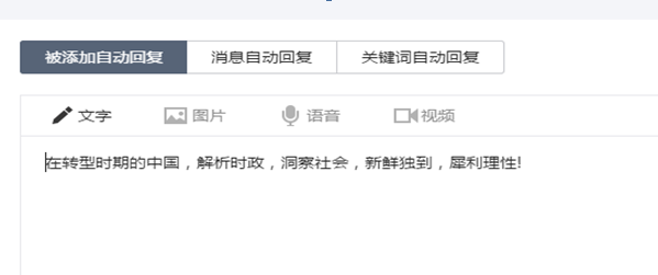 而自动回复也是一个相当重要的功能,被添加自动回复就是粉丝关注你之后显示的那条欢迎语,消息自动回复是粉丝在对话框里给公众号发送消息,公众号可以设置一些相关的回复内容,而关键词自动回复是指粉丝通过 对话框中输入关键词,系统自动回复想要的文字、资源、链接。靠这些功能可以完成和粉丝之间的一种被动交流,是维系粉丝关系的好方法。