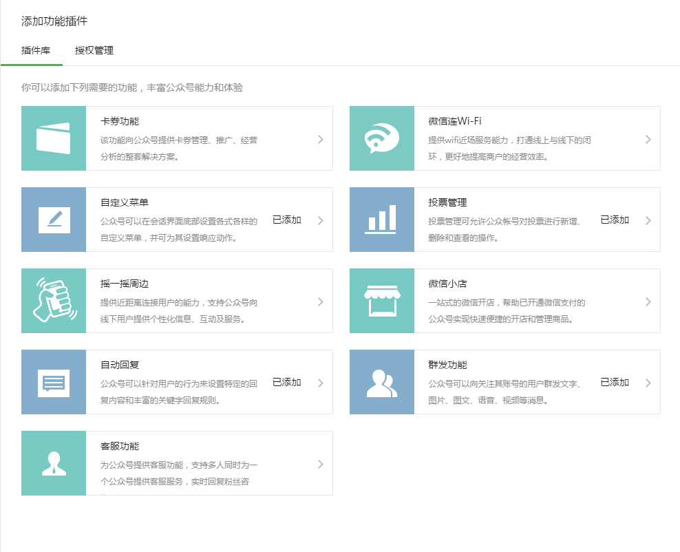 另外在最下方还有添加功能插件的功能,实际就是为运营公众号提供更多的功能拓展,这里还包括了第三方插件的授权管理,让你把公众号的功能做得更强大,内容更丰富,通过这些插件的添加使用,让你做出一个有个公众号。值得注意的是,这里还可以通过公众号来开启微店的功能,帮助你做好把粉丝转化成消费者。