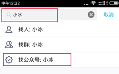 3、搜索“小冰”,并选择“找公众号:小冰”。