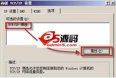 2)在窗口中央处有一个“此连接使用下列选定组件”选项,其中可以找到“Internet 协议(TCP/IP)”,选中它后再次点击鼠标右键,在新出现的属性窗口中单击“高级”按钮,进入高级TCP/IP设置。切换到“选项”标签,在“可选设置”中就可以发现我们的主角“TCP/IP筛选”。双击“TCP/IP筛选”,即可对其进行设置。