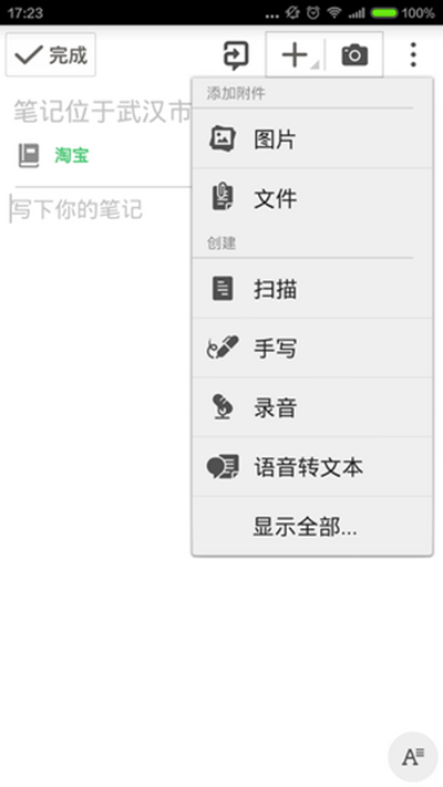 文字记录是可选择添加图片与文件,也可创建手写、扫描、录音、语音转文本等。