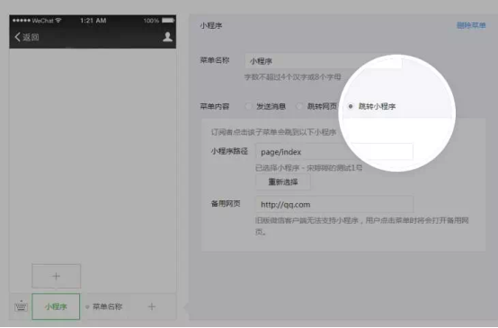 2、 公众号自定义菜单点击可打开相关小程序