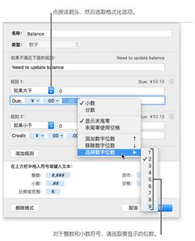 键入格式的名称,然后点按“类型”弹出式菜单,并选取“数字”。