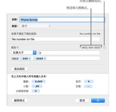在下面的示例中,输入的所有正数显示为带有区号(952)的电话号码。在单元格中键入“5555103”,它会显示为“(952)555-5103”。在单元格中键入类型“0”,单元格会显示“文件上没有数字”。
