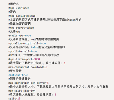 Aria2有两种下载模式,一种是命令行下载模式,一种是RPC Server模式。前者不建议使用,后者的使用方式很方便。 RPC模式就是启动之后什么也不做,等着通过RPC接口接受下载请求。下载完也不会退出,一直等待。 使用命令行加参数的方式配置Aria2非常不推荐,建议使用配置文件的方式,下面贴出我的配置文件。