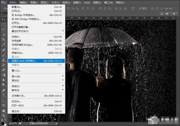 3、点击工具栏上的文件按钮,在弹出的菜单中,点击“存储为WEB所用格式“按钮;