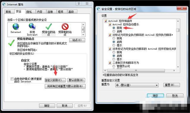 仍然在安全选项卡界面,选中“受信任的站点”,点击”自定义级别“按钮,打开安全设置对话框。找到ActiveX控件和插件这个树形分支,除了第一项”ActiveX控件自动提示“选择禁用,其他项一律启用。
