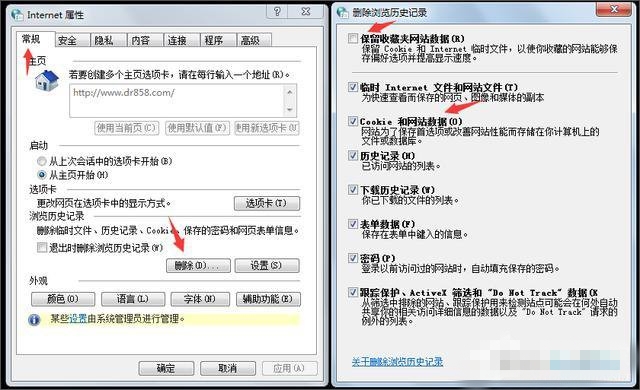 在Internet选项中,常规选项卡,点击浏览历史记录那里的”删除”按钮,这是IE11的界面,其他版本位置会有些不一样。在删除浏览历 史记录对话框中,第一项”保留收藏夹网站数据“的勾取消,否则不清理收藏的网站,”Cookie和网站数据“这个一定要选,其他的你看着办咯。