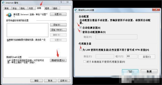 在Internet选项中的连接选项卡,点击“局域网设置”,在弹出的局域网设置对话框中,除了第一项“自动检测设置”可选可不选,其他一律取消勾选。