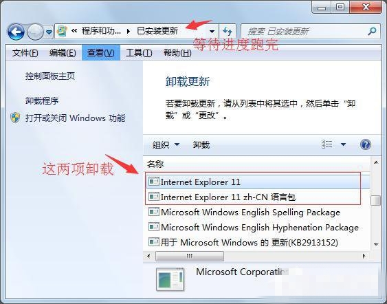 在程序和功能中,点击左边的“查看已安装更新”,等待地址栏进度条跑完,然后列表中找到Internet Explorer 11和语言包都卸载,重启电脑再使用Windows update将浏览器更新回来。