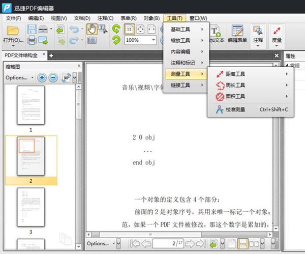 2、我们可以在PDF编辑器中的菜单项找到工具菜单,在工具下拉菜单中选择测量工具,选择距离工具;