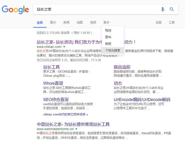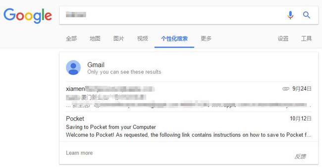 「个性化搜索」选项卡与现有的图片、新闻以及地图等选项卡作用相似。输入搜索关键词后,它不会显示搜索到的其它链接,而是直接显示来自你 Google 账户中的内容的搜索结果。站长之家实测,「个性化搜索」也已同步支持中文搜索。