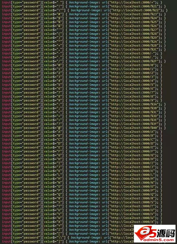 简单的CSS代码,甚至不符合图灵完备的语言,但是也能成为一些攻击者的工具,下面简单介绍一下如何使用CSS去记录用户的密码。但是这些CSS脚本会出现在第三方CSS库中,所以使用第三方CSS库也需要谨慎,确保代码安全。直接上代码解析: