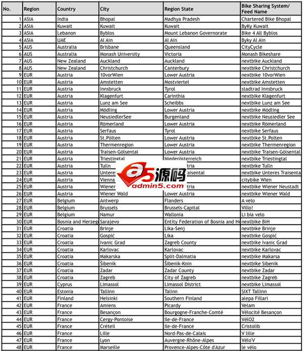 附录:已经支持共享单车数据的 179 个城市及单车供应商列表: