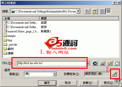所指定的連結內容要出現在哪個框架中,請點選目標框架的「變更」鈕(如下圖的 2)