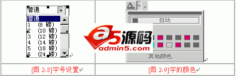 字的颜色:单击“格式”工具栏“字体颜色”按钮旁的向下箭头[图2-9],选择适当的颜色,字的颜色就改变了。