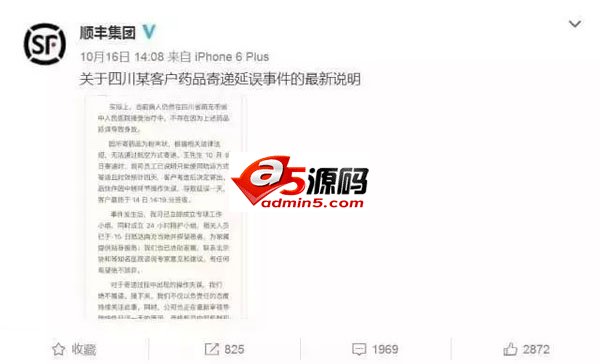 10 月 15 日,杭州的王先生亲戚因脑干出血入院,后委托王先生在杭州购买“申捷针”用于抢救治疗,但药品于 10 月 9 日通过顺丰速运寄出后,直到 14 日药品才抵达四川省南充市,而病人已于 13 日被宣布脑死亡。顺丰集团官方微博于 10 月 16 日14: 08 给出回应。