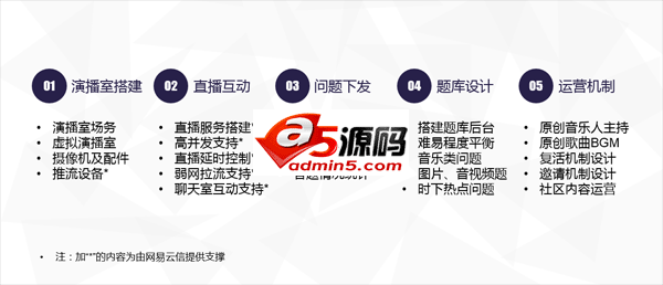 为了更好的抢占流量先机,网易云音乐要求能够尽快上架,并且由于APP调性的要求,还需要突出音乐垂直领域的特点,与APP用户的需求相结合。我们将方案分解为演播室搭建、直播互动、问题下发、题库设计、运营机制。