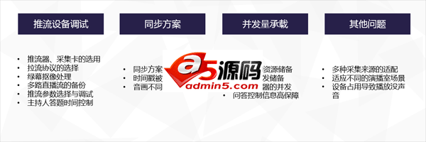 直播竞答的场景,结合我们之前做直播、IM的一些经验,我们把难点归为四类:推流设备调试、同步方案、并发量承载及其他问题。