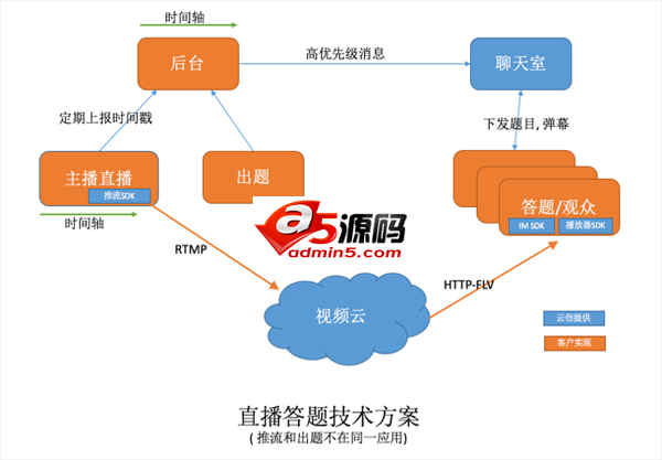 主播端通过摄像机或摄像头连接PC推流应用进行直播推流,拉流需要通过http-flv协议进行拉流。题目由运营人员通过出题页面事先录入,存储在后台;PC推流应用需要周期性汇报时间戳给后台,后台维护时间轴。