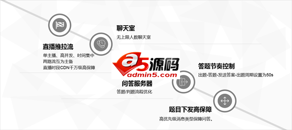高并发承载包含很多个环节,包括直播推拉流、聊天室、问答服务器、答题节奏控制以及题目下发高保障。