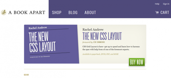 A Book Apart也是一个销售书籍等相关商品的商城网站。这个网站也充分利用了自身的优势,不使用漂亮、美观的背景图片,而是借助多彩的书本封面来辅助产品销售。这在展示一个系列的书籍时尤为适用。