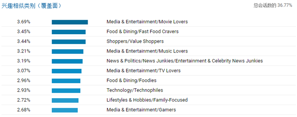 兴趣报告中不仅有兴趣相似类别,还有具体兴趣者细分,其他类别,这里我们就用兴趣相似类别来举例。那么这些兴趣报告对于一个运营或者是产品来说有什么样的作用呢。