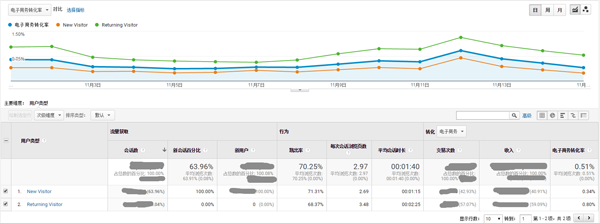 用户报表里所说的行为并不是指客户来网站做了什么,主要是指新老客户。拉新和留存永远都是运营应该想的问题,但是大家也都知道,拉新一般都是维护一个老客户两到三倍的成本。因为老客户的平均质量远优于新客户。从图标上可以看出老客户的转化率远胜于新客户,也远高于平均值。