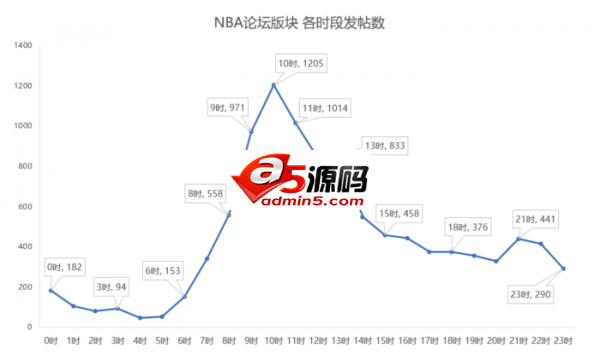 由图可知,NBA论坛版块的用户发帖数从上午8时左右开始飙升,并在上午10时达到了一天中的峰值,最后在14时左右回到相对较低的水平。