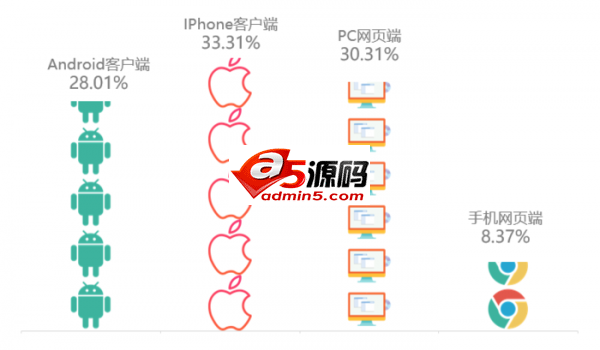 值得一提的是,IPhone客户端用户占比比Android客户端多了5.32%(据艾瑞咨询2017年10/30-11/5移动设备指数统计,IPhone设备占比仅为24.88%)。