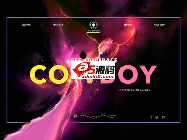 Event Agency网站是另外一个范例,它在首屏使用的设计方法要更加特别一点。这个网站的首屏主要是围绕着Logo和品牌名称设计,布局左右平衡,各有两个菜单项供访客快速浏览自己感兴趣的内容。更引人注目的还要数星河的背景图片和超大字体文本的配合,在第一时间带来了令人震撼的视觉效果。