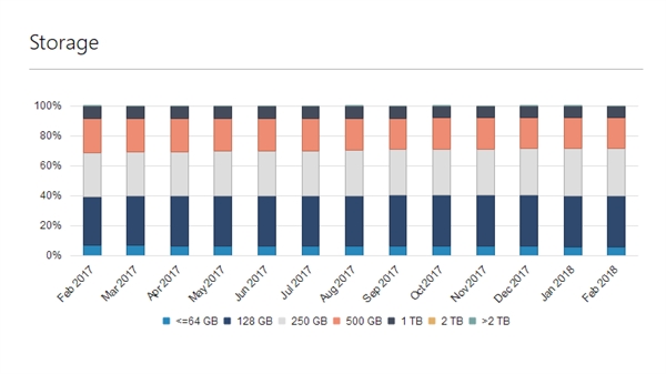 硬盘容量方面,500GB占到了29%,1TB也有21%,250GB还有22%,但应该是把固态硬盘和机械硬盘混合到了一起。