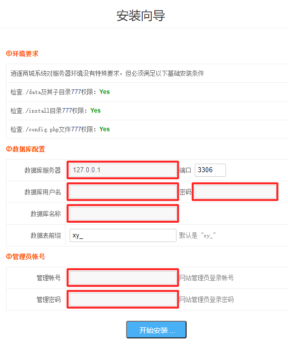准备好以上三点后,将源码上传至服务器的网站根目录,执行http://你的网址/install/index.php即可进行安装,安装时,请填写数据库连接信息,数据库连接地址(一般是localhost),数据库名,用户名,密码这些信息,具体如下图所示: