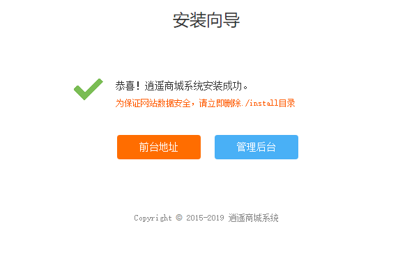 填写完成后,点击“开始安装”按钮,稍等片刻,当出现下图所示内容时,说明已经成功安装了,点击“前台地址”可以进入首页查看网站,点击“管理后台”并使用刚才设置的用户名密码就可以登录后台。