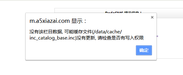 今天在提交一键更新的时候,出现了一个这样的错误提示:没有该栏目数据, 可能缓存文件(/data/cache/inc_catalog_base.inc)没有更新, 请检查是否有写入权限,如下图: