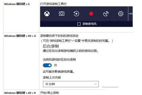 注:Windows+Alt+G,使用前需在游戏DVR板块中将后台录制按钮激活(可参考上图中的表格)。该功能会占用一定资源,开启后会录制直至按下这个快捷键的最后过程。