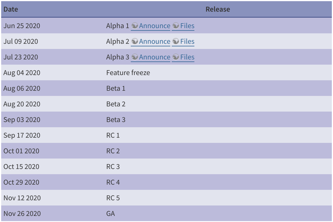 其中,删除了 RC6 使计划与其它活跃分支的发布保持一致。也可以看到,8.0.0 正式 GA 日期为 11 月 26 日。