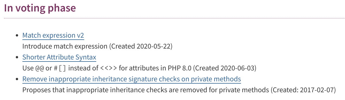 此外还注意到几个处于投票阶段的特性(也就是可能比较快会并入某个版本中的),像 match expression(匹配表达式)与使用 @@ 或 #[] 替代 <<>> 的提案都是比较值得关注的: