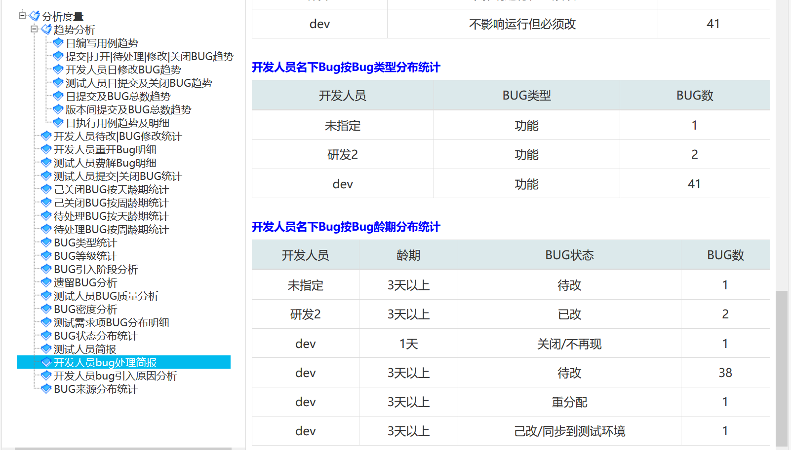 开发人员处得BUG简报 : 有开发人员BUG数统计, 也有按bug状态按人分布,按bug等级按人分布,
